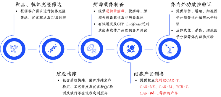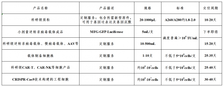 • 国内唯一逆病毒载体稳转工艺体系,复购相同目的序列的逆转录病毒载体,立享优惠,并在10天内交付;